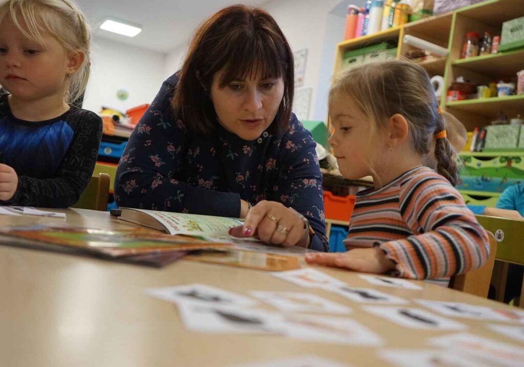 Malé děti se mohou učit nápodobou od starších. Hodně k tomu využíváme centra aktivit, takové koutky, kde děti ve skupině řeší různé úkoly. A ty velké se zase učí trošku o někoho pečovat, starat se.